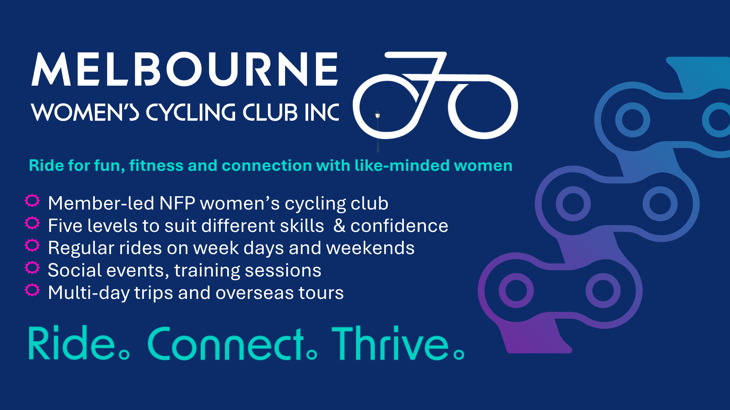 Melbourne Women’s Cycling Club (MWCC) is a new not-for-profit, incorporated association and a supportive, vibrant women’s cycling club based in Melbourne, Victoria. MWCC is more than just a cycling club – it’s a place to connect, grow, and share the joy of riding in an inclusive, supportive and welcoming environment where every woman can thrive.